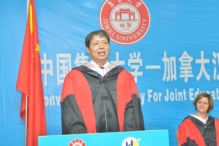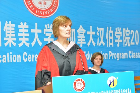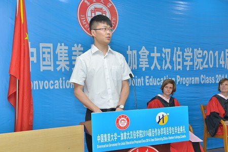 汉伯学院商学院院长Cassiani在典礼上讲话,对2012级汉伯学子们顺利完成在国内两年的学业,对2011级汉伯学子顺利完成第三年加拿大留学学业表示祝贺,对集美大学与汉伯学院8年愉快而密切的合作表示赞赏,希望同学们在毕业之际要向父母、老师、同学及身边帮助过自己的每一个人表示感谢,同时以勇敢自信的精神面对未来,无论选择工作或是深造学习,都祝福同学们有一个美好的未来。