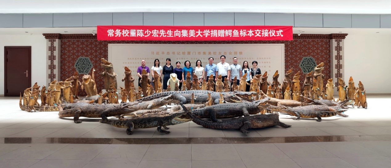 日前,我校常务校董陈少宏先生向我校无偿捐赠一批鳄鱼标本,献礼集美大学水产高等教育50华诞。集美侨联主席陈群英女士、陈少宏公司代表陈秀宝女士、李贤先生以及我校党委宣传部、国际合作交流处、水产学院等部门负责人及工作人员出席交接仪式。