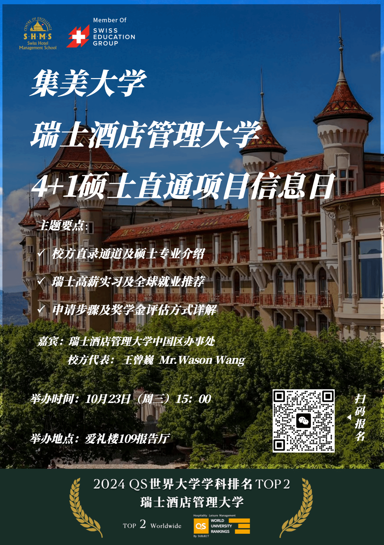 SHMS瑞士酒店管理大学,成立于1992年,隶属于SEG瑞士教育集团,SHMS瑞士酒店管理大学(Swiss Hotel Management School)是全球唯一一所由五星级皇宫酒店改建而成的酒店管理大学,也是瑞士规模最大、专业最丰富的酒店管理学校,曾被评选为“全球最美校园”,在 QS 世界酒店管理学科排名中位居全球第2位。