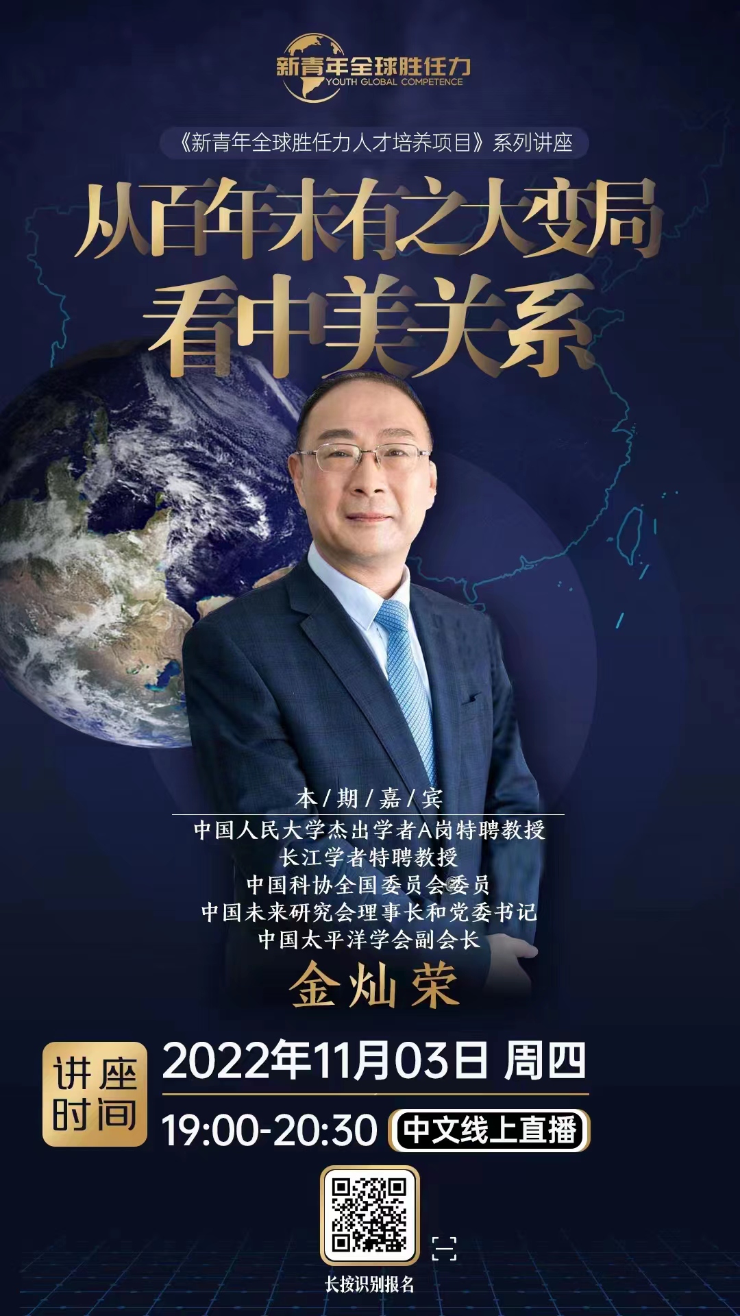 金灿荣教授是一位颇负盛名的博导教授,是著名的国际问题专家,对国家之间的问题有着更透彻的看法。其语言幽默风趣、直白犀利,思考问题角度新颖、见解独到,可以将复杂的国际局势举重若轻的展现在大家面前。本场讲座,金教授将就“从百年未有之大变局看中美关系”主题进行深度分析和解读,通过风趣幽默的语言,深入浅出的从历史大视野审视当下的中美关系,探究促使中美关系发生变化的原因,从而进一步分析中国的发展及中美关系。